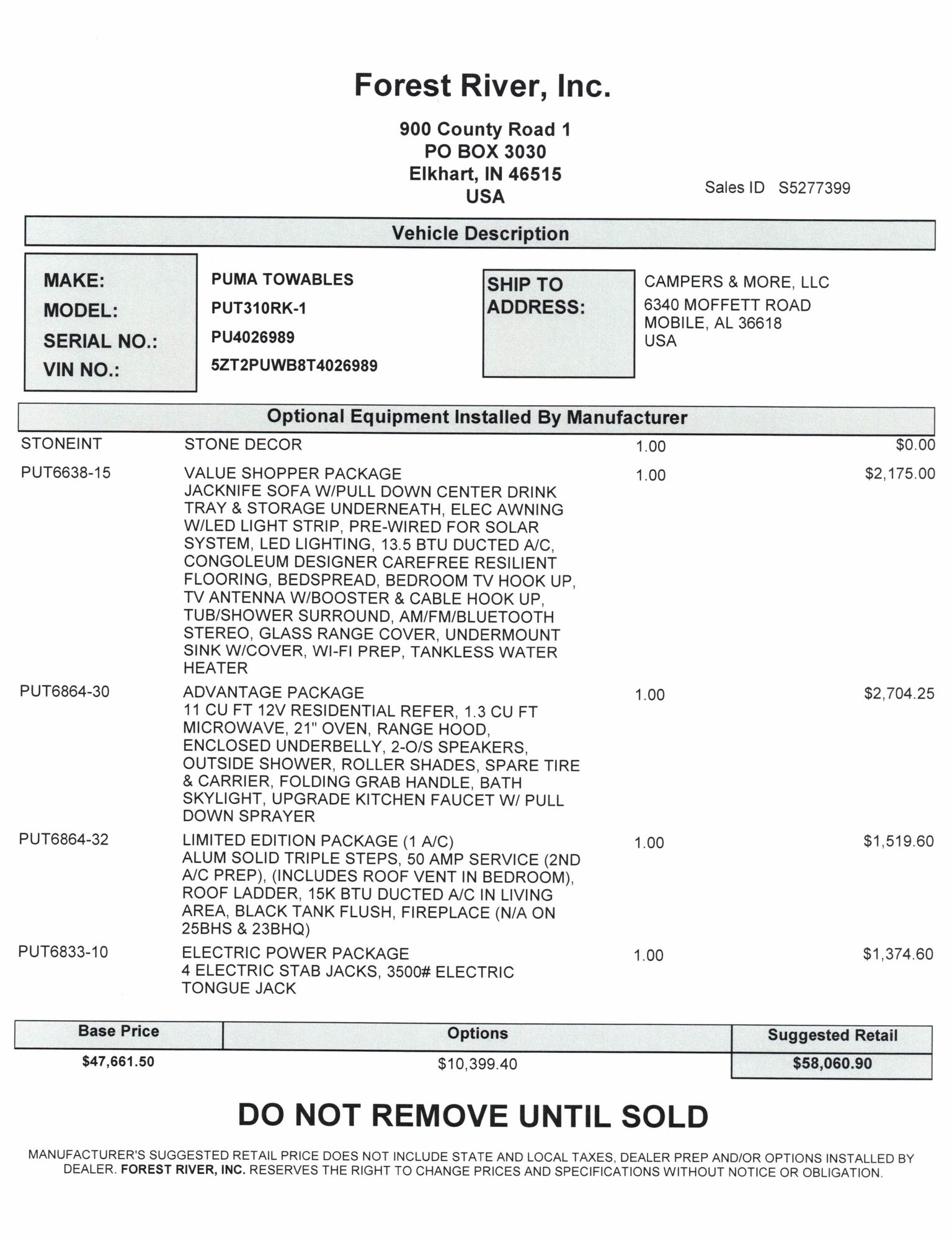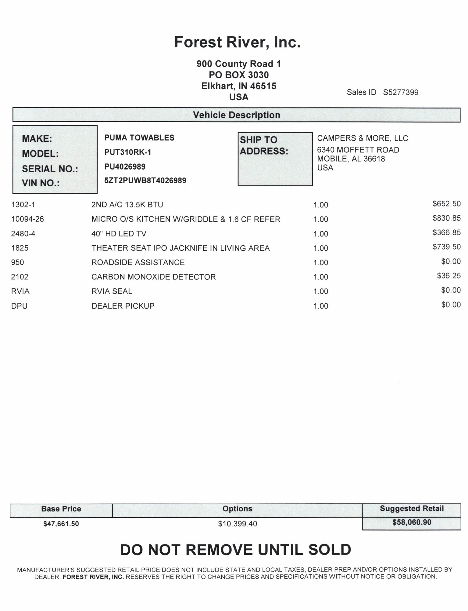 All units are serviced and inspected. A final “walk-through” will be performed upon delivery of your camper.